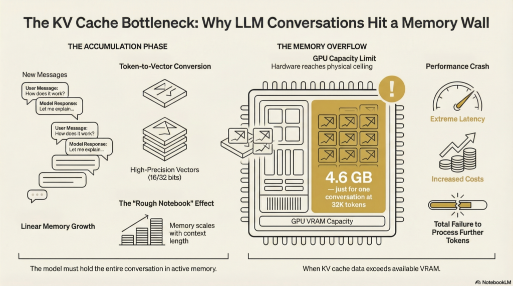 The math is unforgiving. For an 8B parameter model running at 32,000 tokens of context, the KV cache alone consumes around 4.6 GB of VRAM. That is before model weights, before any computation. Just the memory of the conversation. Scale that to multiple concurrent users, or to the context windows now measured in hundreds of thousands of tokens, and you run out of hardware fast.